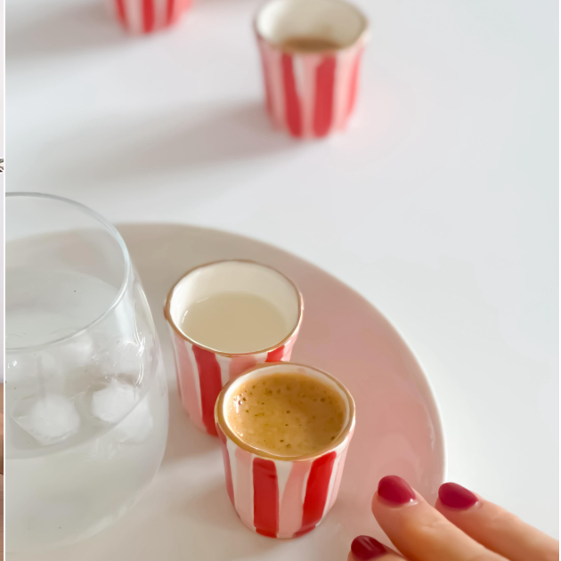 Hand-painted, colourful and full of Carla Dinnage charm - this gift box set includes four striped cups, great for your early morning espresso coffee shot to start the day, and then perfect for a shot of your favourite liqueur to end the day.