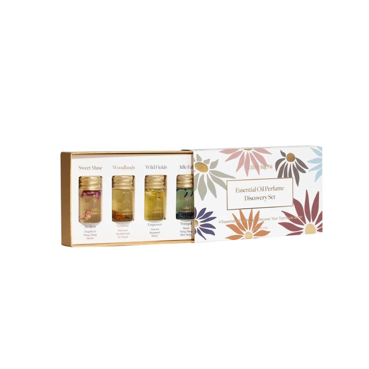 Discover your signature scent with Stray Willow's Essential Oil Perfume Discovery Set, featuring four Australian-made natural perfume rollers: Sweet Muse, Woodlands, Wildfields, and Idle Falls.